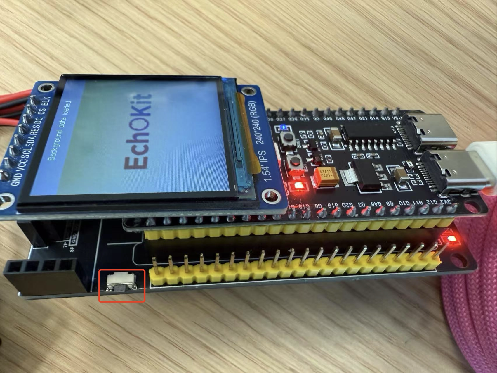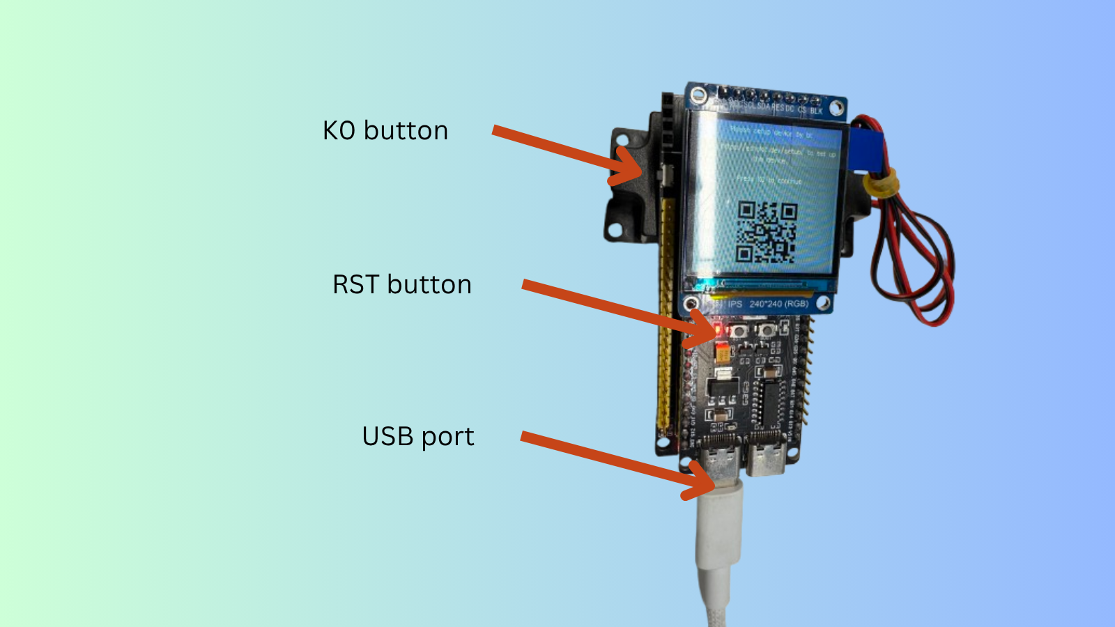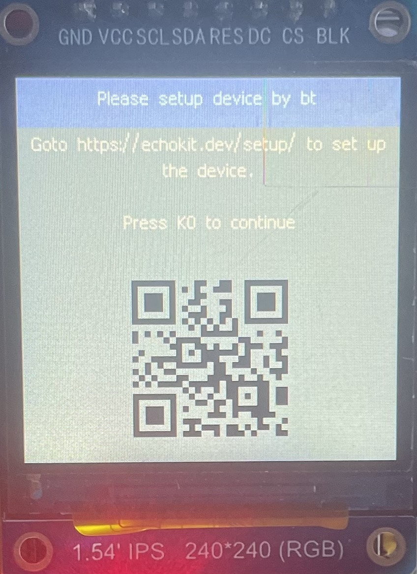 You will see the QR code display on the EchoKit screen. If not, click on the RST button to restart the device, and then immediately, press and hold the K0 button.